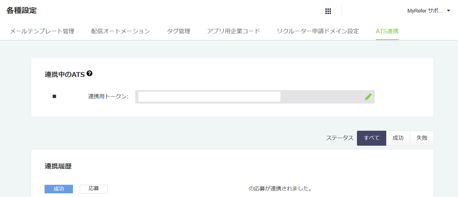 求人や応募のATS連携に関する履歴は、MyRefer管理画面>各種設定>ATS連携ページよりご確認頂けます。
