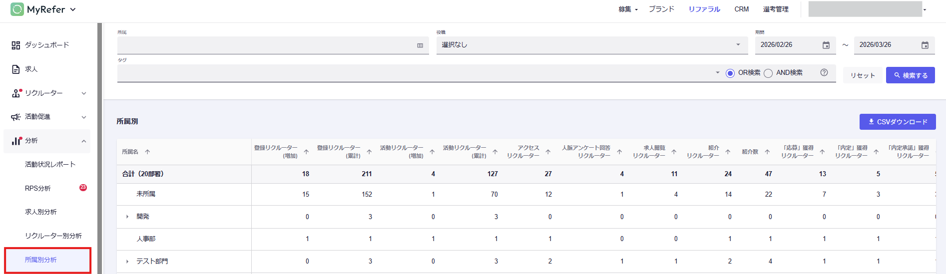 「所属別分析」は、標準の管理者権限であれば自由に閲覧・CSVダウンロードが可能です。